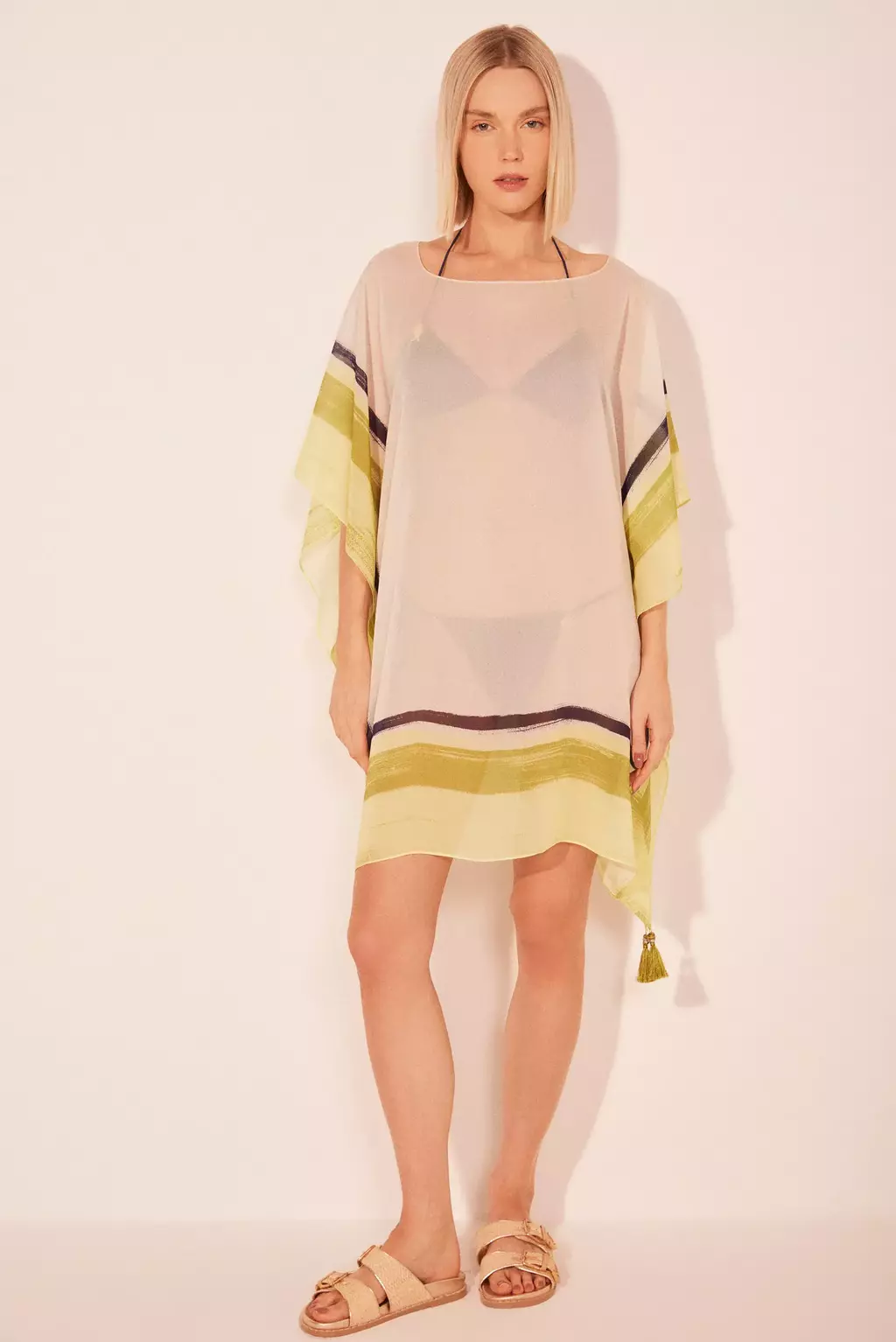 A Túnica Curta Listrado Peixes, em georgette de viscose, possui comprimento curto e decote canoa, criando um visual fluido e elegante. A modelagem quadrada, sem recortes, garante conforto e liberdade de movimento, enquanto a finalização com tassel nas pontas traz um toque único e exclusivo à peça.