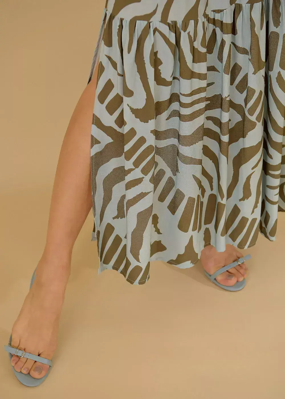 Vestido longuete, feito no tecido plano, na estampa Isola Bella. A peça possui gola padre com decote em V, marcação em elástico na cintura, detalhe em recorte com babados sutis no decorrer do comprimento da saia e fenda lateral. Possui uma modelagem fluida, proporcionando um perfeito caimento ao vestir. Uma peça versátil para arrasar na composição de looks maravilhosos! Composição: 100% Viscose